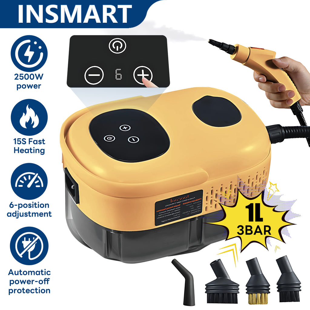 INSMART High-Pressure High-Temperature Steam Cleaner for Home & Car features a 6-speed adjustable steam system, reaching up to 212°F high temperature and 3BAR high pressure, effectively dissolving grease and efficiently removing debris. With a 2500W high-power motor, it achieves 15-second rapid heating and a 34-ounce large capacity for extended cleaning. It includes dry-burn protection and automatic power-off safety features, making it safe and portable. It comes with 12 accessories, and the entire unit is made from eco-friendly ABS material, offering true multi-functionality for deep cleaning across multiple scenarios for the whole family.