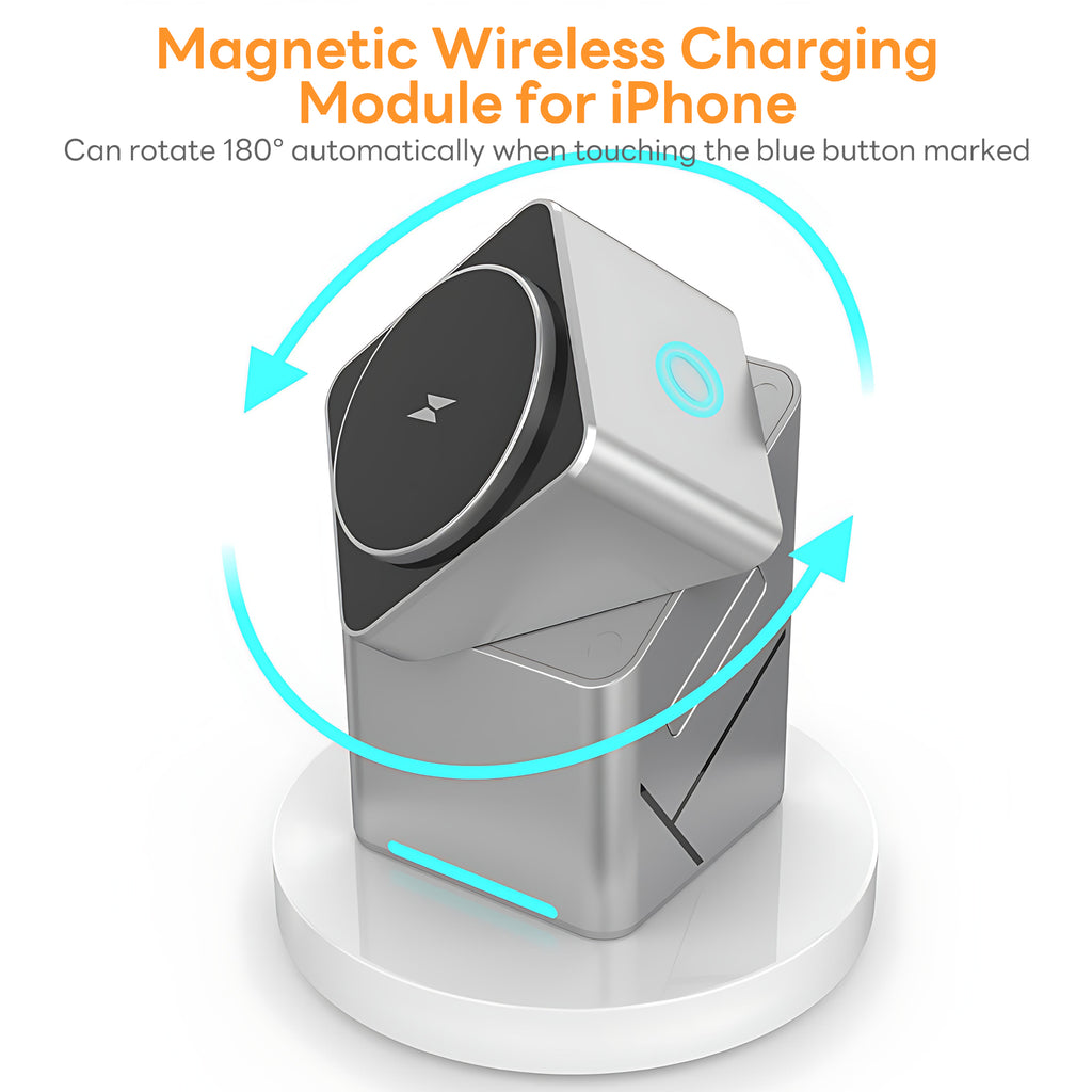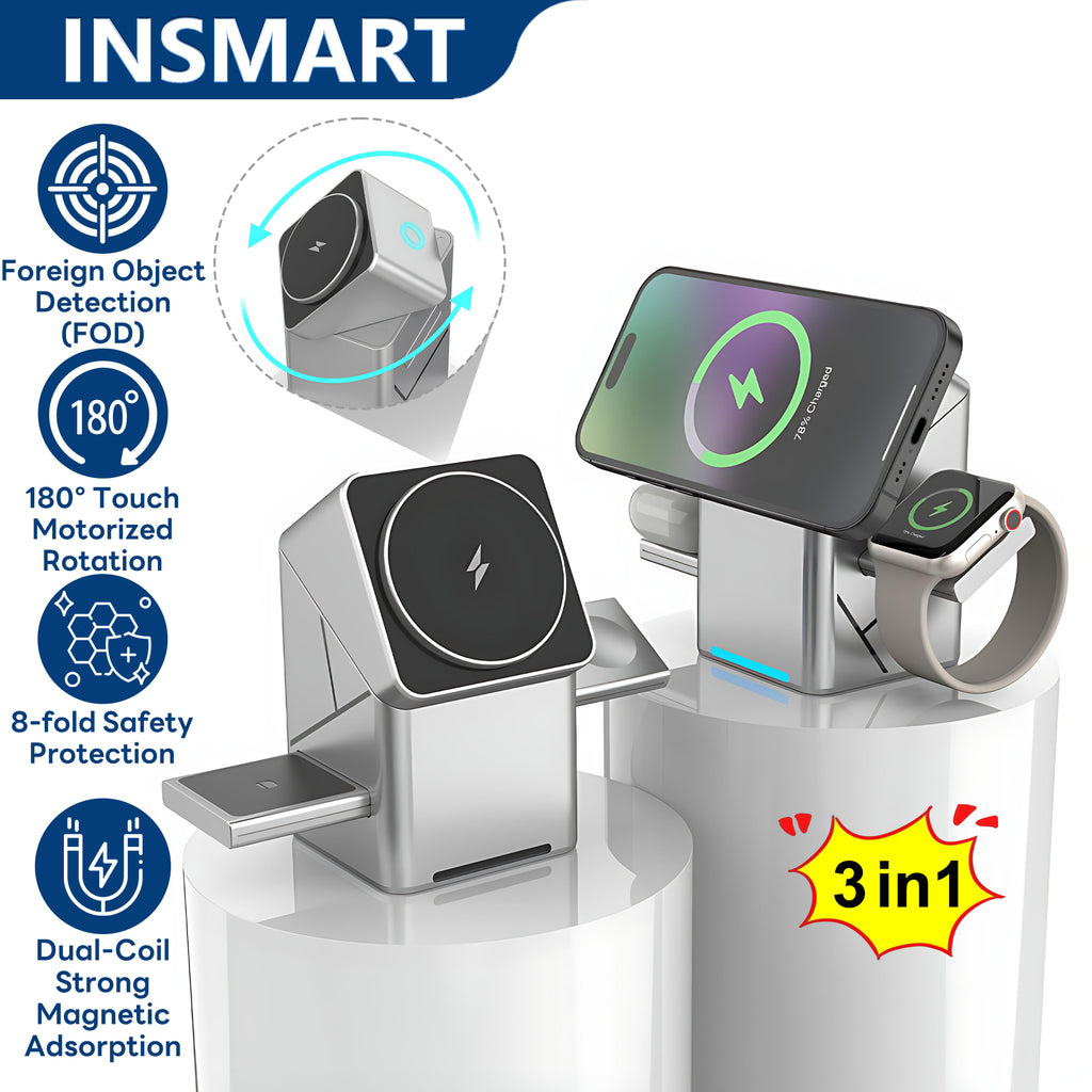 The INSMART 3-in-1 Magnetic Wireless Charging Station combines efficient charging with smart protection, supporting simultaneous fast charging for iPhone (15W), Apple Watch (2.5W), and AirPods (5W). Featuring an innovative 180° motorized rotation, a simple touch of the sensor button allows seamless switching between landscape and portrait orientations. Dual-coil magnetic alignment ensures strong adhesion, while full Qi compatibility is complemented by intelligent FOD (Foreign Object Detection) and 8-layer safety protection. Its compact 4.2“ x 2.6” x 2.6" footprint saves space, making it ideal for both home and office use.