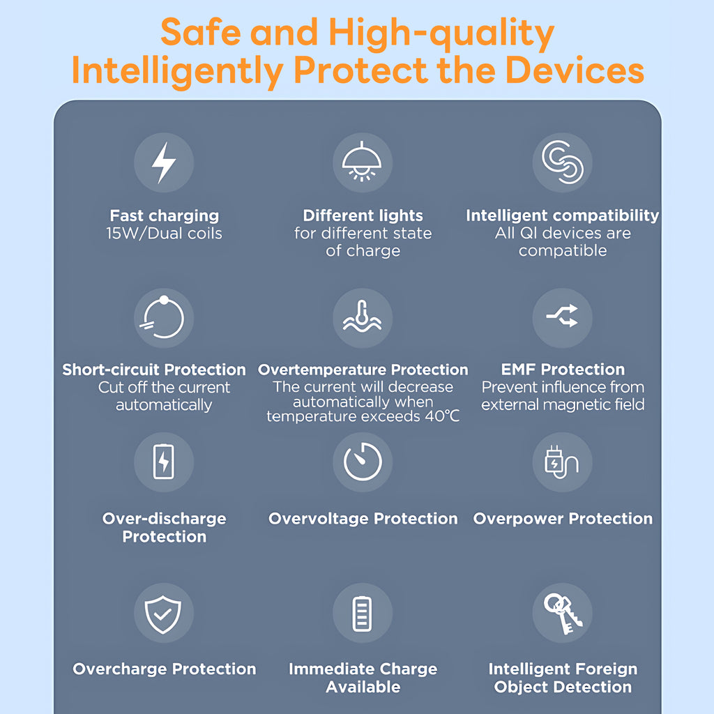 Safety Protection Features: Foreign Object Detection (FOD) automatically halts power supply and flashes a blue LED when detecting metal objects like keys, coins, or bank cards; Short-circuit protection, temperature protection (automatically reduces current when exceeding 40°C),electromagnetic field protection,overcharge / over-discharge /overvoltage/overpower protection,ensuring safe charging without damaging devices.