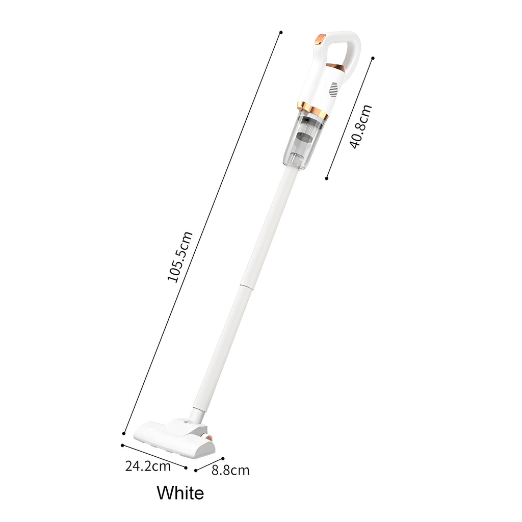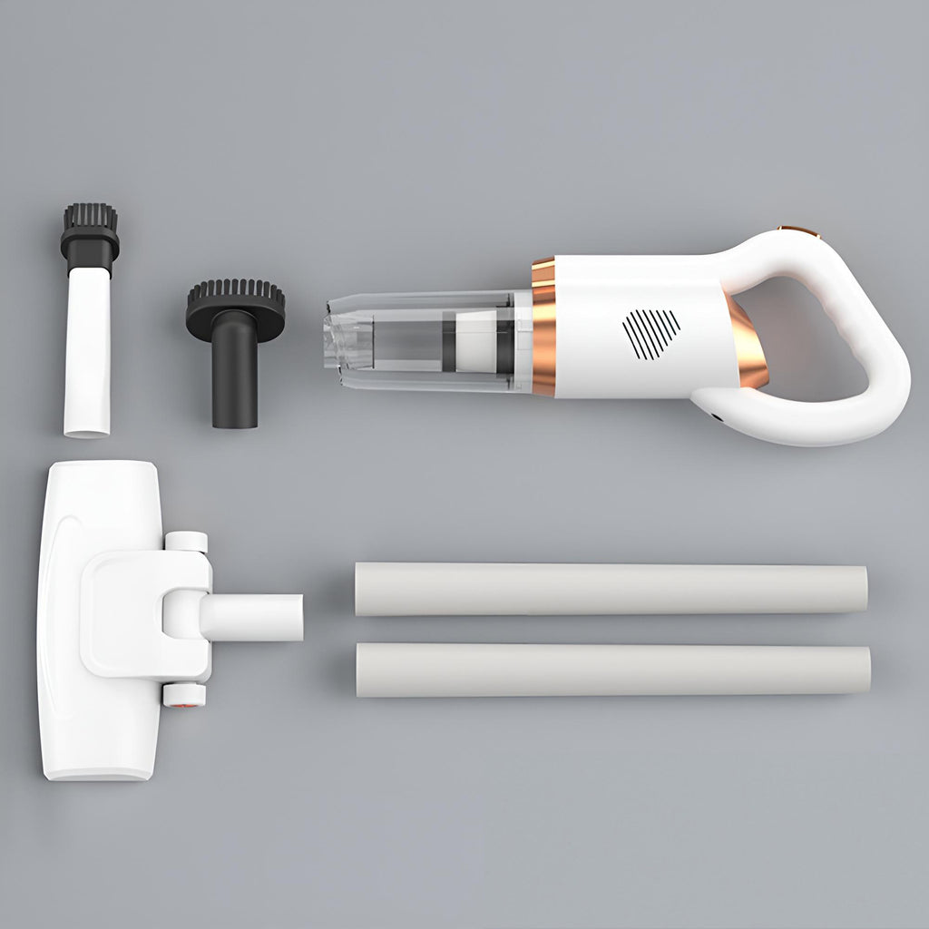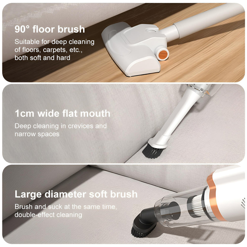 The body is crafted from ultra-lightweight ABS material, making it incredibly portable and easy to handle. The package includes three interchangeable brush heads: a dual-surface floor brush, a crevice tool, and a pet hair brush. It can be quickly switched to handheld mode, effortlessly tackling diverse cleaning tasks like floors, sofas, car window gaps, keyboards, and more.