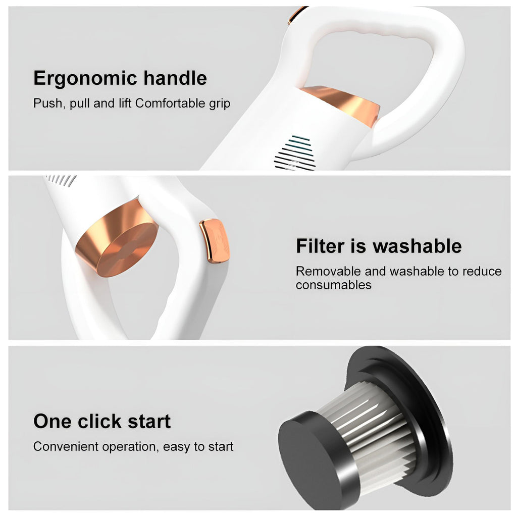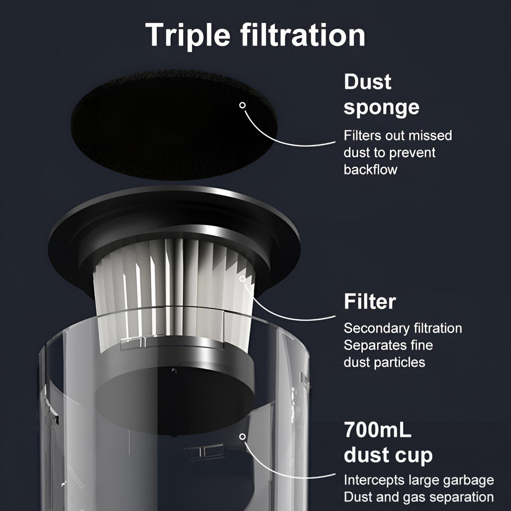 The 0.6L large-capacity dust cup reduces the hassle of frequent emptying. Both the dust cup and filter are removable and washable with water. After air-drying, they can be reused, eliminating the need for ongoing consumable purchases while offering a more eco-friendly and economical solution.