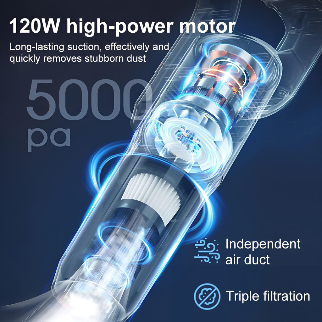 Equipped with a high-performance motor, it generates powerful suction up to 5000Pa, instantly removing dust, food particles, and pet hair trapped in the crevices of carpets and hard floors. The cordless design ensures unrestricted cleaning, effortlessly tackling every corner of your home or car interior.