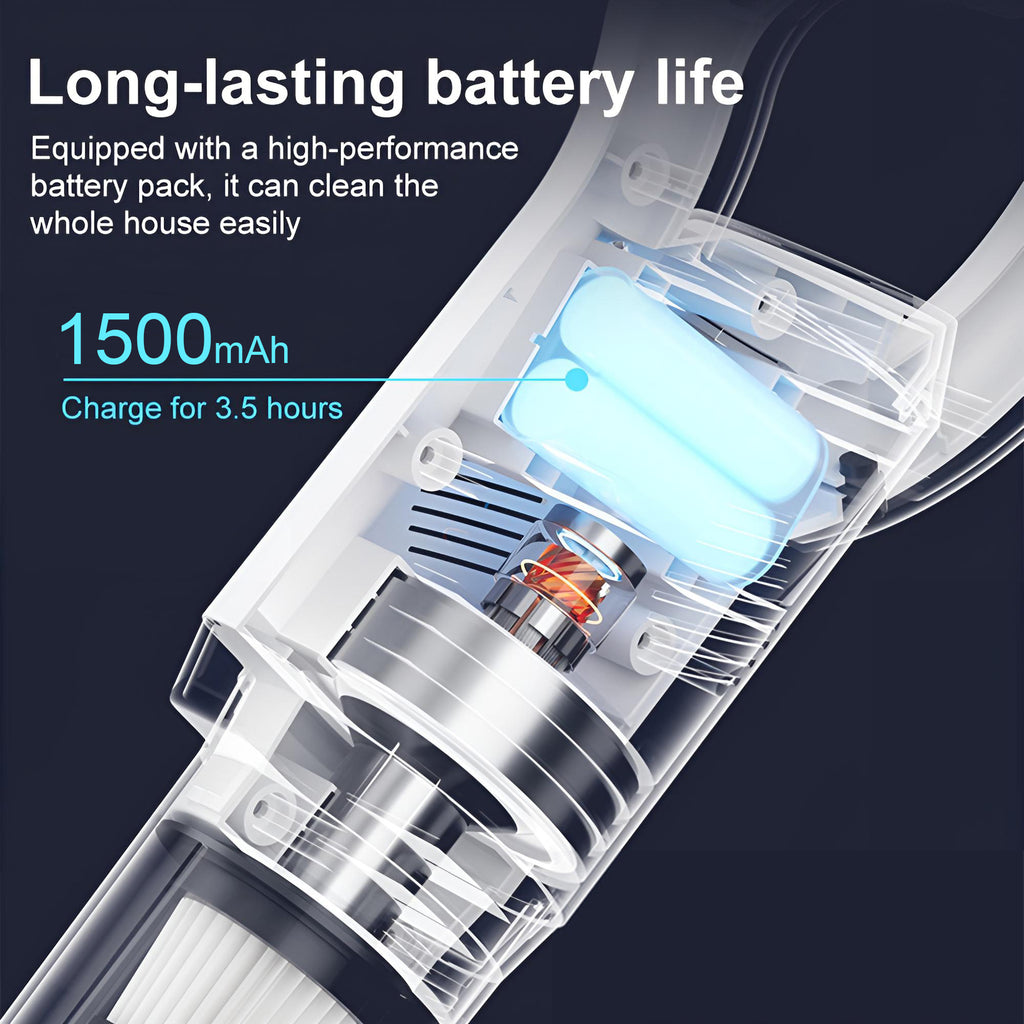 Equipped with a high-capacity 1500mAh lithium battery, it delivers up to 30 minutes of continuous operation in standard mode, meeting daily cleaning needs for small to medium-sized homes. Featuring a universal USB charging port, it fully recharges in just 3-4 hours—conveniently refueling anytime like a power bank, ready for action whenever needed.