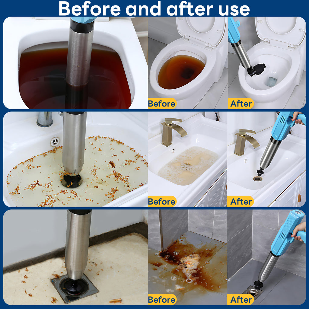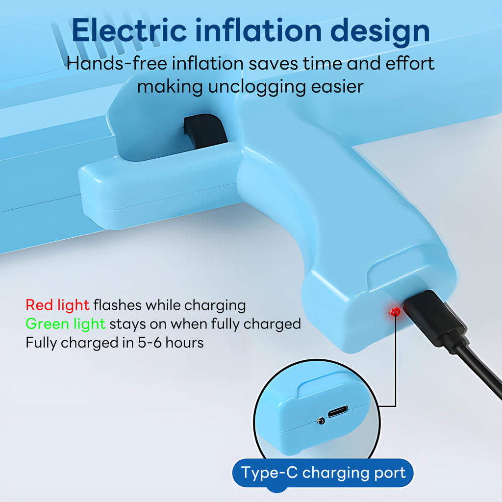 INSMART Electric High-Pressure Air Drain Blaster is equipped with a powerful 45W motor, which can generate 8BAR high-pressure airflow (116PSI) with one button start, and intelligently adjust the air pressure (Toilet 7-8BAR/Floor Drain 5-6BAR/Sink 3-4BAR), which can easily solve the blockage of the whole house.Type-C Charging. 1500mAh battery, fully charged, lasts 50 times, wireless and portable. Automatic charging pressure to 4.5BAR and then stop, support the second pressurization (45 seconds), equipped with 4 kinds of professional plugs (suitable for toilet/floor drain/dishwashing sink/wash basin), 304 stainless steel explosion-proof body, visualization of the air pressure gauge and splash-proof design, long-press 3-second emergency shutdown, safe and efficient.24.41 inches lightweight body, the family of multiple scenarios in a single machine to deal with!