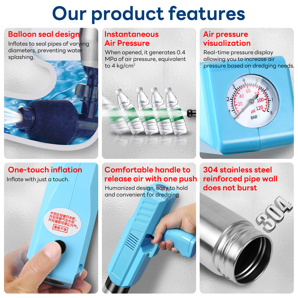 • 【Smart Inflation Technology】: Long press to start, automatically inflates to 4.5 BAR and stops, supports secondary inflation (45 seconds); instantly generates 0.4 MPa air pressure (equivalent to 4 kg/cm² pressure), easily clears stubborn blockages; air pressure visualization gauge displays BAR/PSI values in real time, users can adjust air pressure as needed (1-8 BAR levels suitable for different pipes)