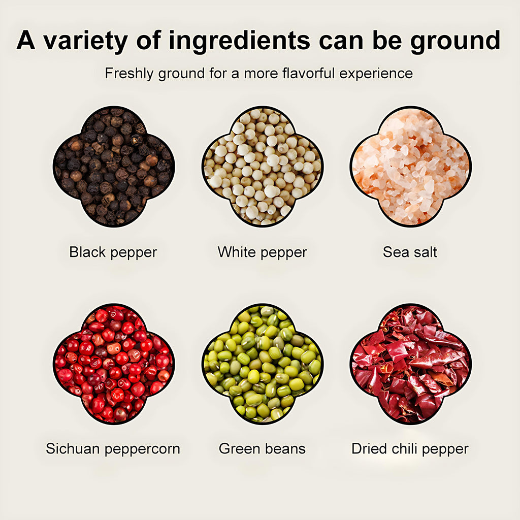 • Effortless Grinding: Single-button operation and adjustable coarseness let you customize spices for any dish—from coarse steak rubs to fine soup seasoning.