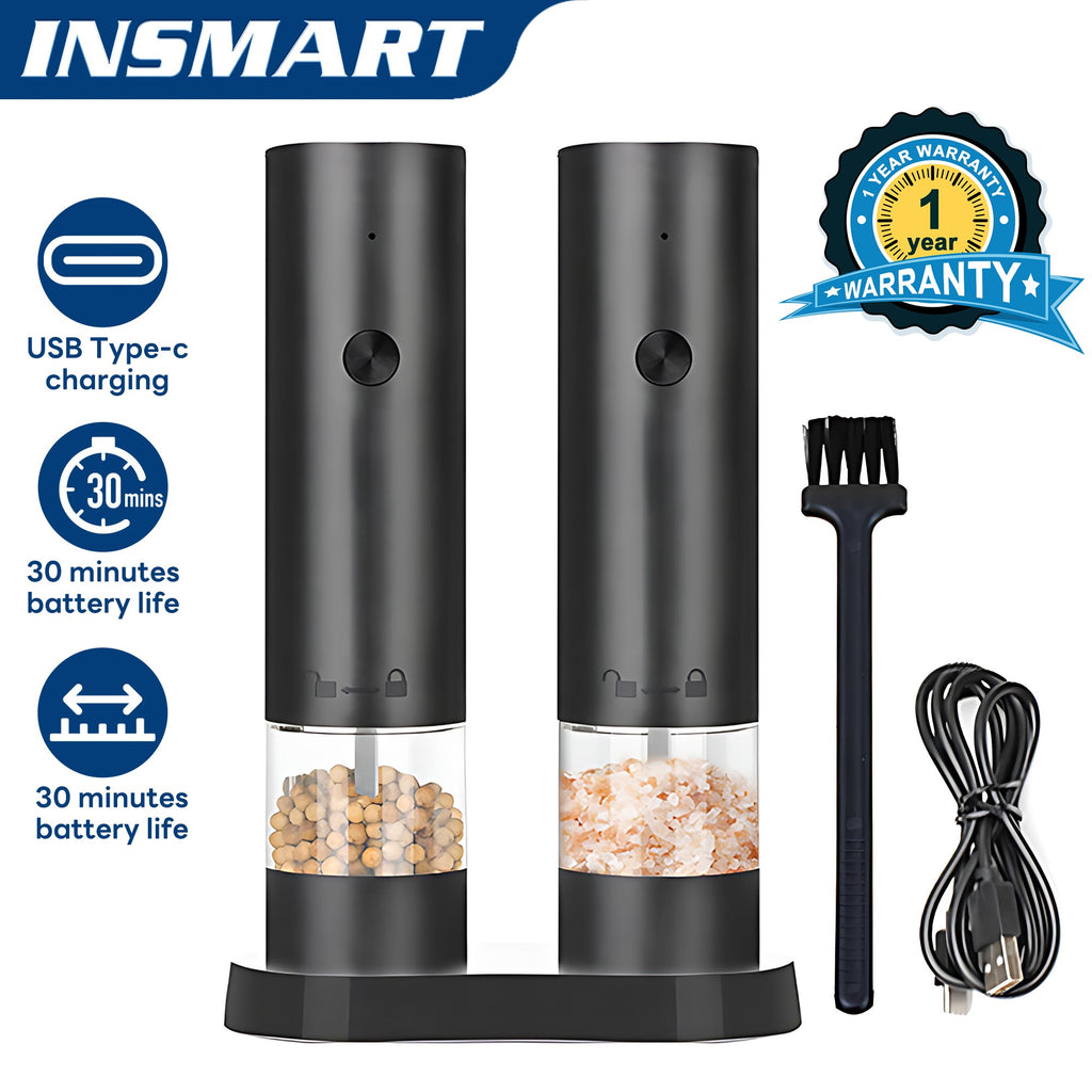 • Featuring USB charging, one-handed operation, adjustable coarseness and a large, transparent storage case, the USB rechargeable INSMART Salt and Pepper Grinder Set offers hands-free convenience and professional-grade performance for the home chef. Unlike battery-operated grinders, our Type-C charging system eliminates the cost of batteries and provides more than 30 minutes of continuous use, making it ideal for home kitchens, outdoor events and gift-giving scenarios, and meeting the modern consumer's need for a smart, functional and aesthetically pleasing kitchen tool.