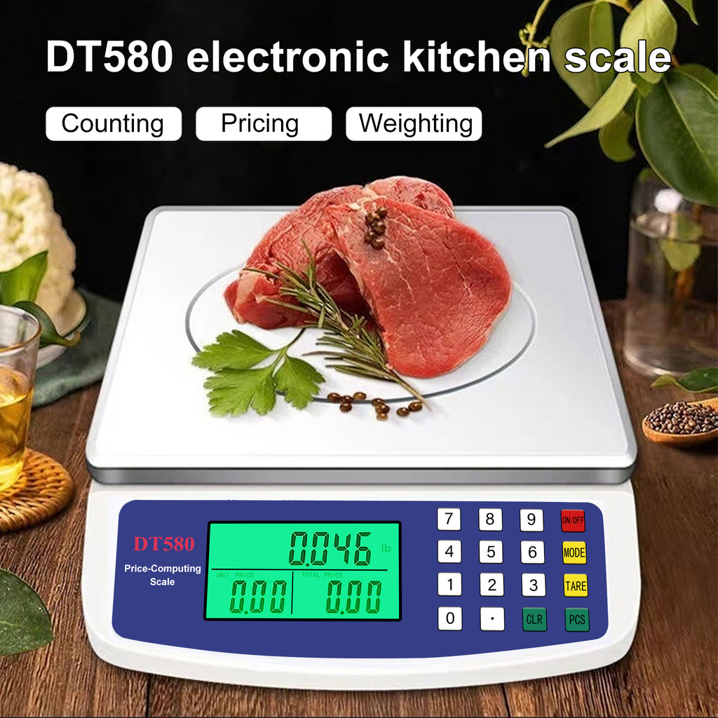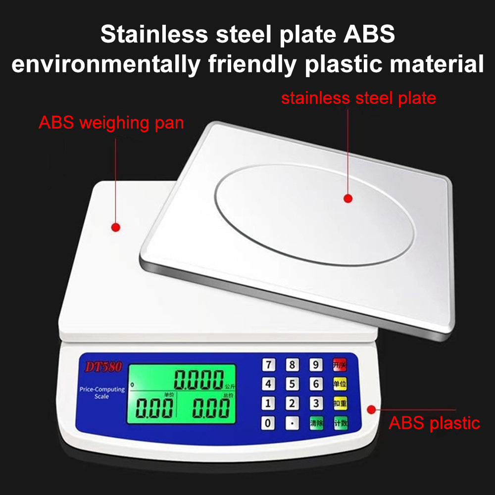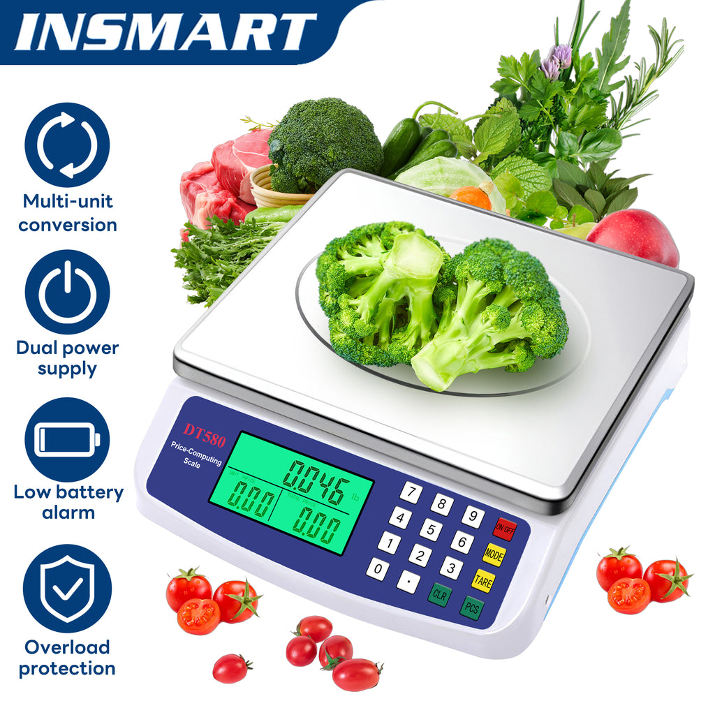 The INSMART 30KG large electronic kitchen scale combines high precision and large capacity, with a maximum load capacity of 30 kilograms and an accuracy of 1 gram, meeting the weighing needs of baking, cooking, and commercial use. Supports one click switching between multiple units of kilograms and pounds, and has functions for piece rate and price calculation, making it intelligent and practical. Equipped with a green backlit LCD screen, it is clear and easy to read even in low light conditions; Adopting a stainless steel scale pan and ABS frame, it is sturdy and durable, supporting both battery and plug-in modes. Suitable for various occasions such as home kitchens, farmers' markets, and retail stores, with reliable performance and convenient design, it becomes a reliable assistant for your daily and business operations.