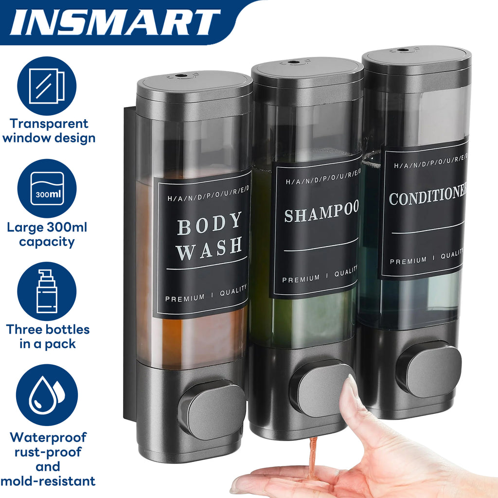Combining luxurious beauty with rugged functionality, the INSMART 3 Bucket Dispenser is designed to instantly organize space in apartments, dorms, gyms and busy home bathrooms. Sort shampoo, conditioner and body wash into 3 clear 300ml containers (at a glance!) Leak-proof pump for precise dosage dispensing (see at a glance!). Leak-proof pump dispenses precise doses, and kid-friendly jumbo buttons prevent messes. Installs in 60 seconds on any smooth surface without tools. Ultra-strong, rugged ABS material resists steam, drips and corrosion. Fits in tight spaces and holds any liquid - from pet shampoo to detergent!