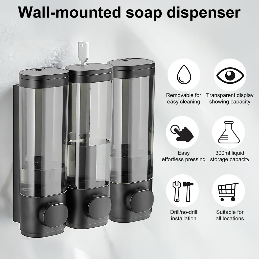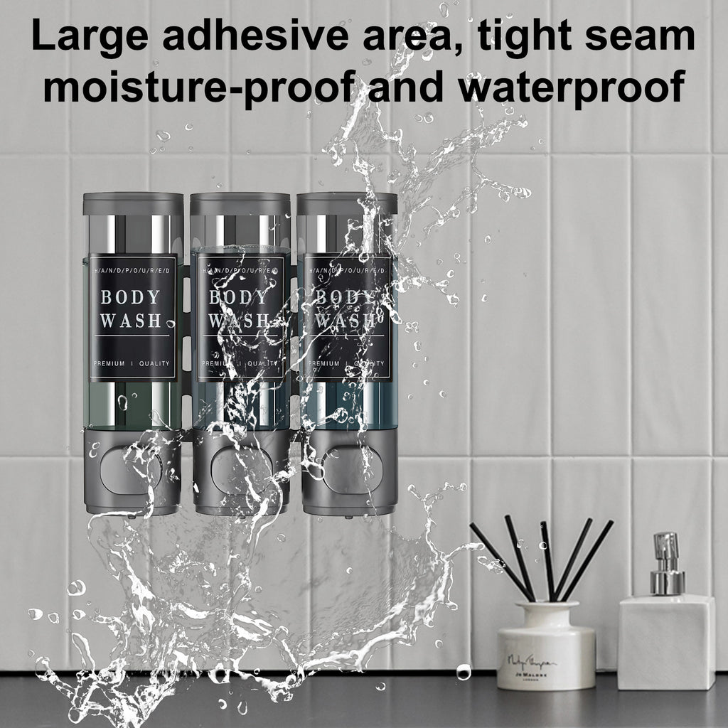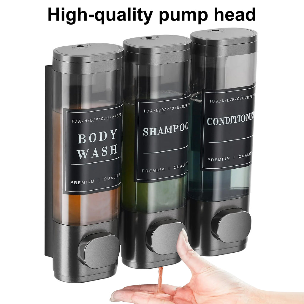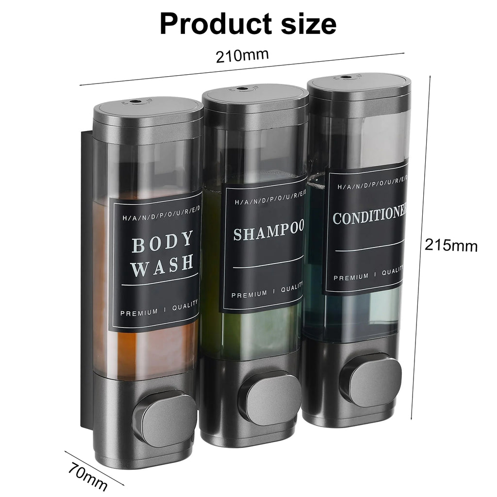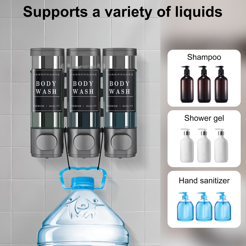 - Three-Bottle Design: Each shampoo dispenser holds 300ml. The transparent window allows clear monitoring of liquid levels. Shampoo, conditioner, and body wash can be stored simultaneously in three dedicated bottles. The large button design facilitates dispensing, ensuring precise liquid output each time. It prevents leaks, saves shampoo, and avoids confusion.