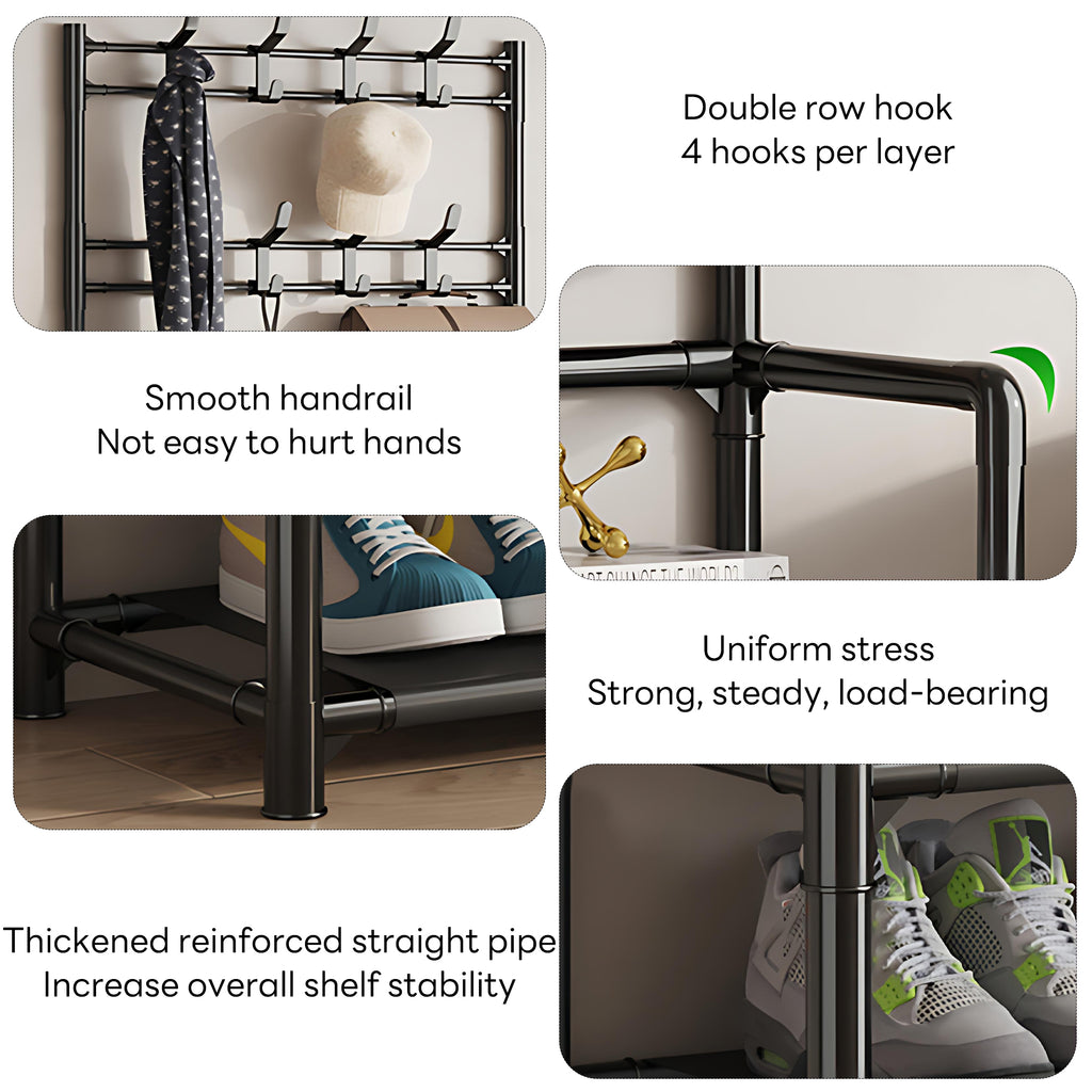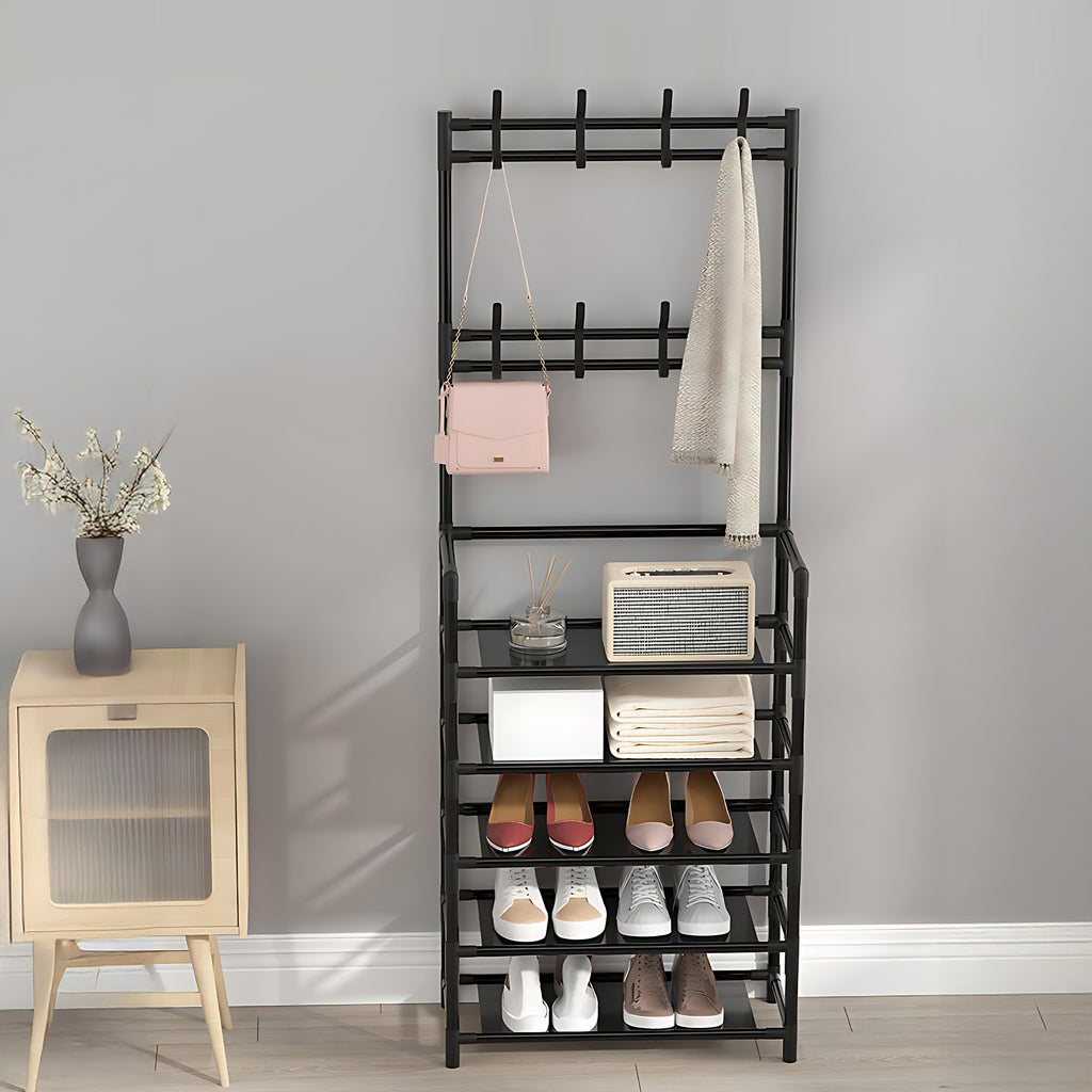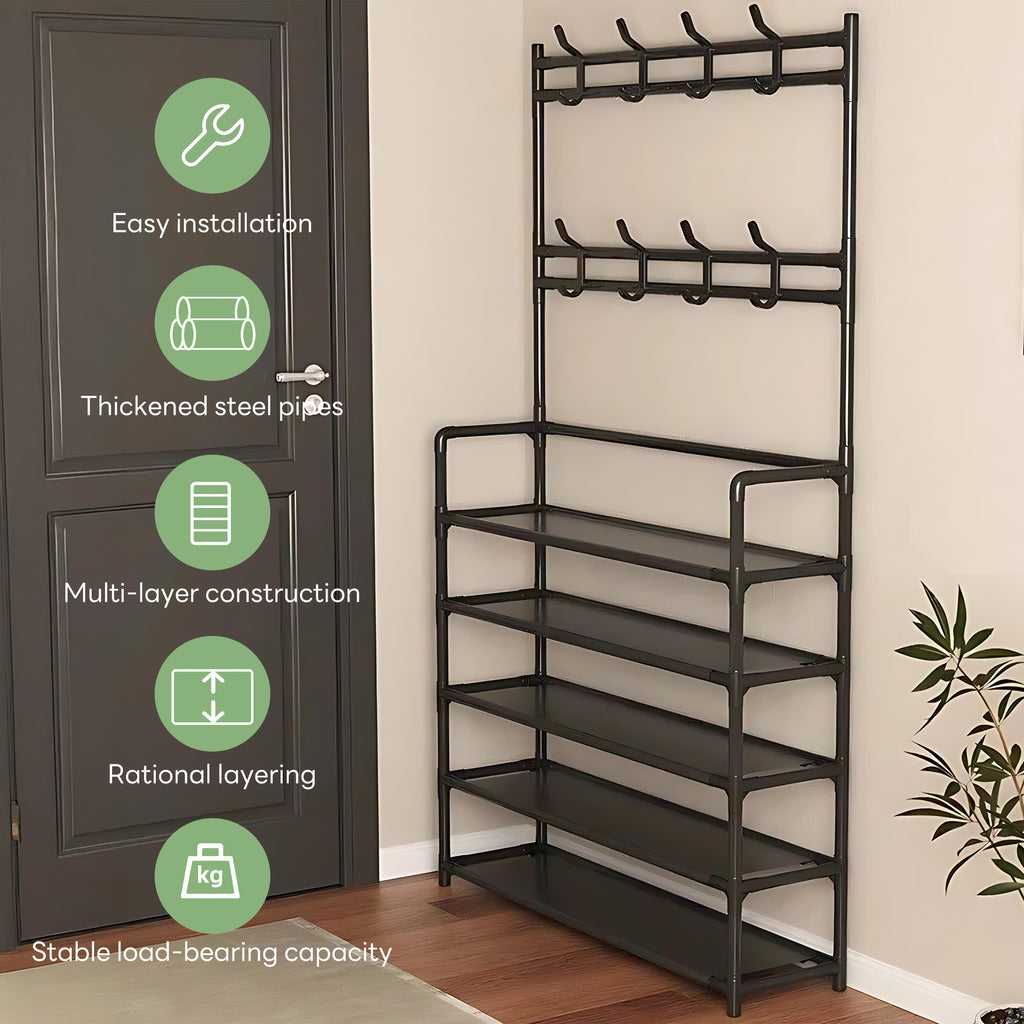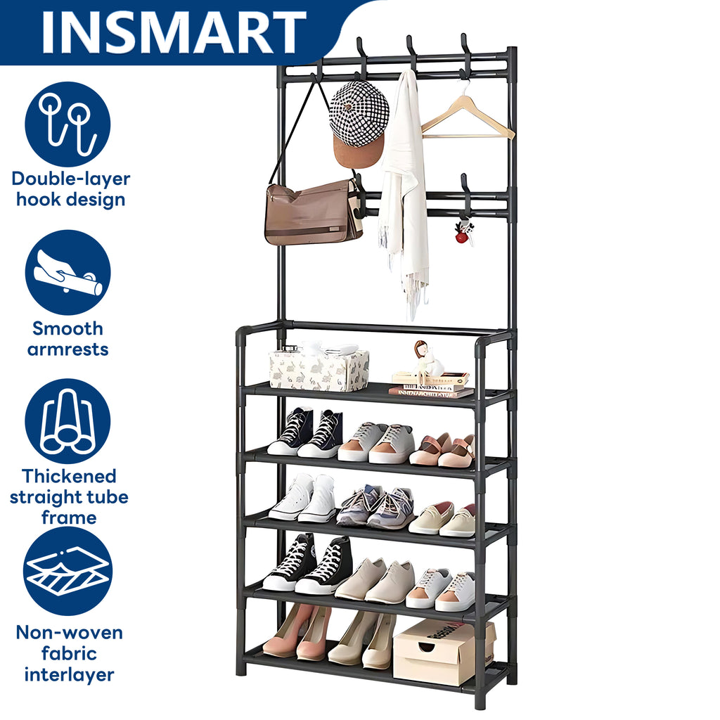 INSMART 5-tier shoe and hat rack is a 3-in-1 design, which combines storage, hanging clothes, hats and shoe racks in one, equipped with 8 fixed hooks and dustproof non-woven fabric compartments, and the compact design of 23.6“ x 9.8” x 66.5" fits perfectly in small spaces. Thickened steel tube and PP connectors ensure solid load bearing, smooth and safe surface, suitable for home use. Quick assembly without tools, simple black color matches all kinds of decoration styles. Cost-effective materials and strict quality control, providing you with a hassle-free and durable storage solution, ideal for organizing entrance halls and bedrooms!