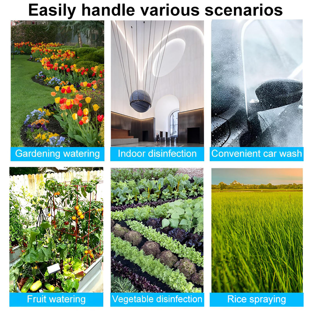 - 【5 Spray Modes for Versatile Use】:Includes 3 nozzles (fan, brass & 6-hole jet) for adjustable spray patterns—from fine mist to powerful jet. Ideal for watering delicate plants, fertilizing lawns, applying pesticides, or cleaning driveways/windows.