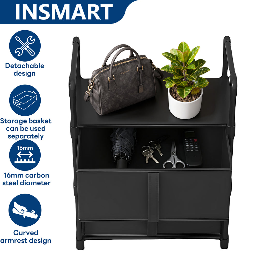 - INSMART Multifunctional shelf with removable double-layer design (17.7 x 13.8 x 23.6 inches) is both a bedside table and flower stand, as well as a living room side table and entryway storage artifact. Thickened 16mm galvanized steel tubes + PP baskets for strong load bearing, rounded handrails to prevent bumping, 3 minutes quick assembly. One thing to solve the bedroom, living room, balcony, entrance, office five scenes of storage needs, small home must have!