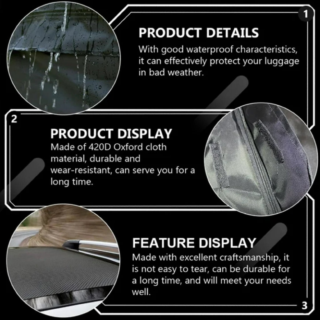 • Durable and Waterproof Material: Made from high-quality 420D Oxford fabric, our Car Rooftop Cargo Carrier Bag is designed to withstand harsh weather conditions, ensuring your luggage remains dry and secure during travel.