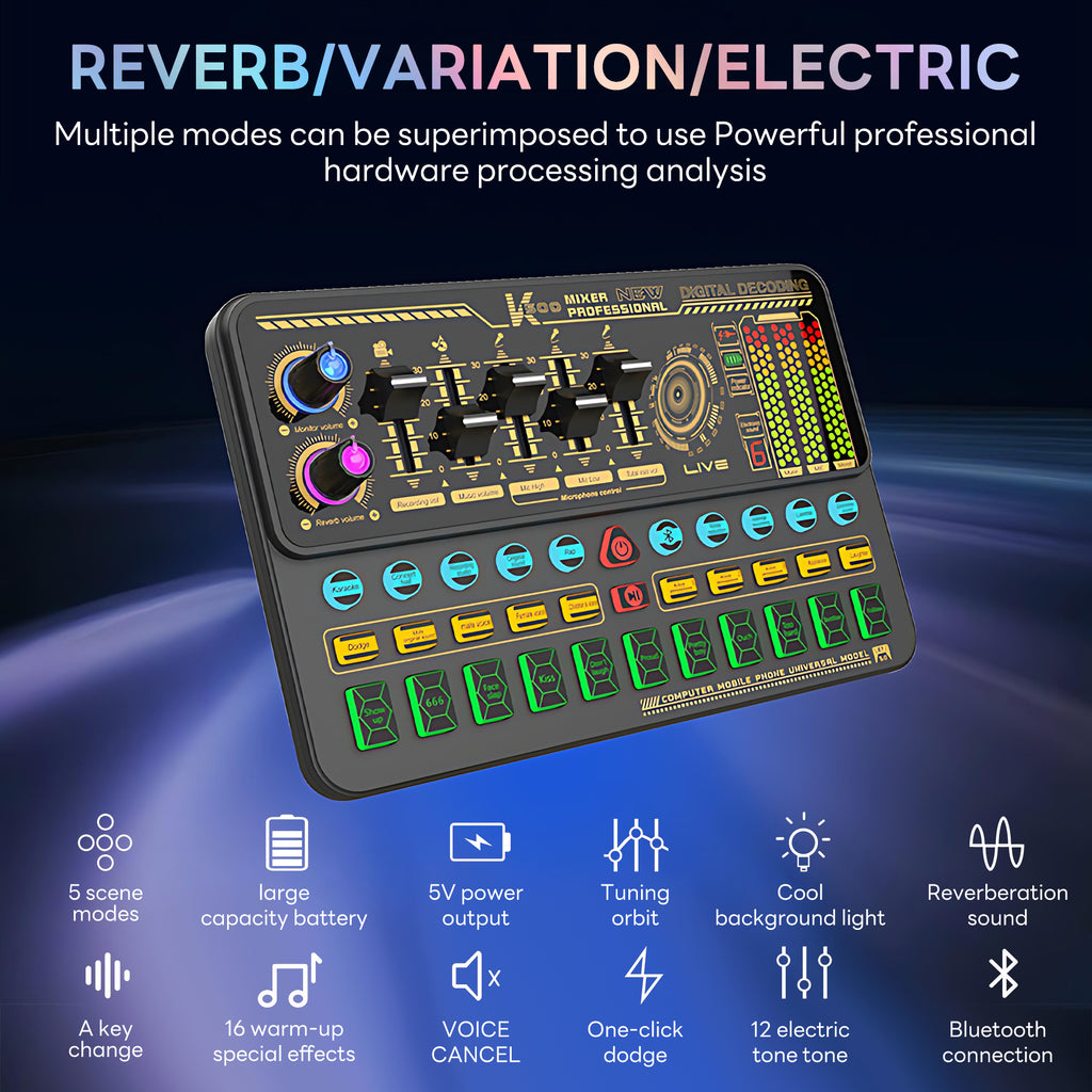 - Electric Sound Adjustment: With 12 timbre and sound effect adjustments such as treble, midrange, bass, reverb, voice changer, etc., make your audio more exciting.